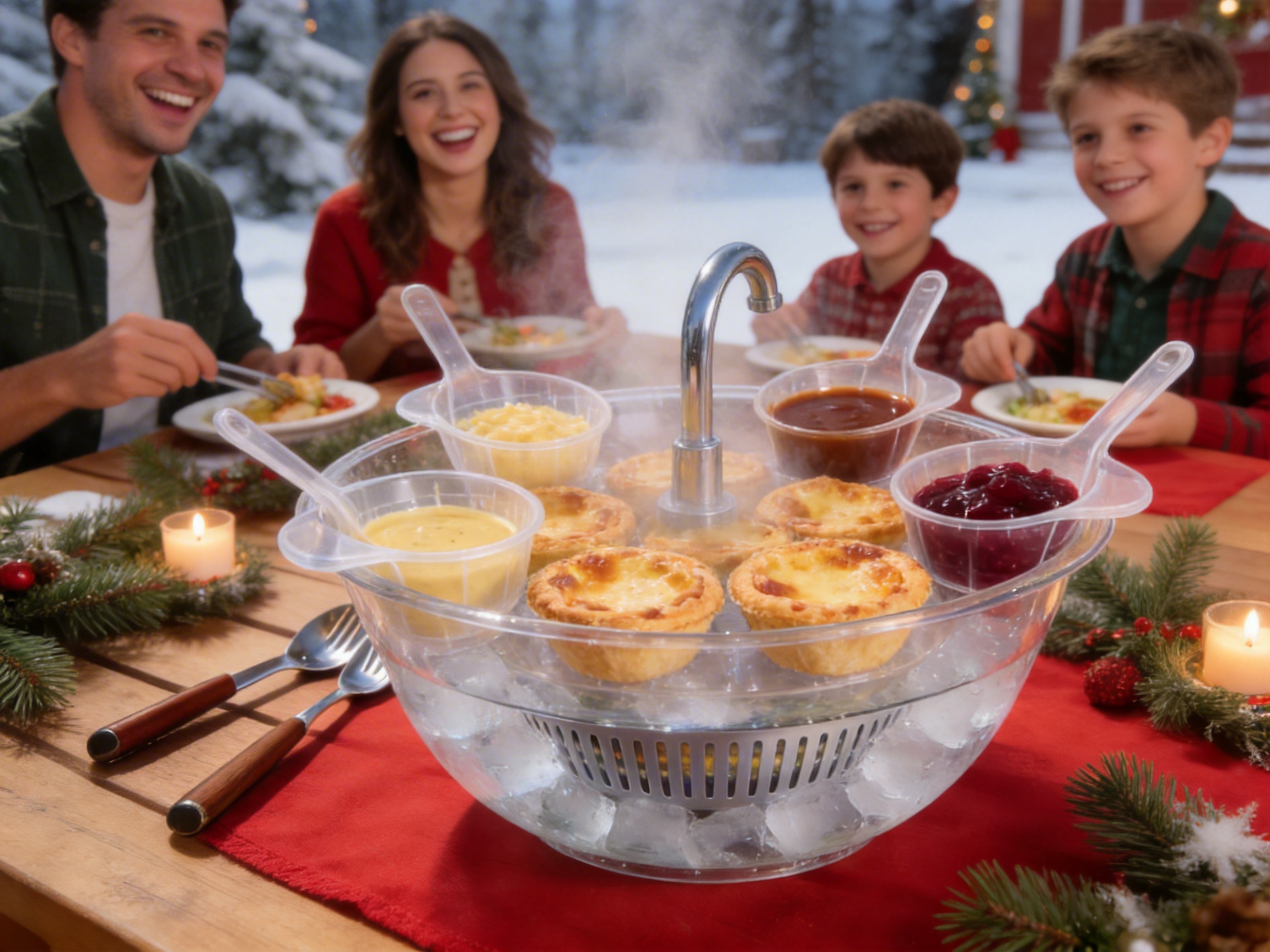 During family dinners or holiday feasts, the Orbit Bowl On Ice can be used to serve: - Cold Salads: Fill the bottom with ice to keep potato salad, coleslaw, or fruit salad chilled. Use side servers for dressing, nuts, or croutons. - Hot Dishes: Use hot tap water to keep mashed potatoes, stuffing, or green beans warm. Side servers can hold gravy or butter. - Desserts: Serve ice cream or frozen yogurt with ice in the bottom, and side servers for toppings like sprinkles, chocolate syrup, or whipped cream.