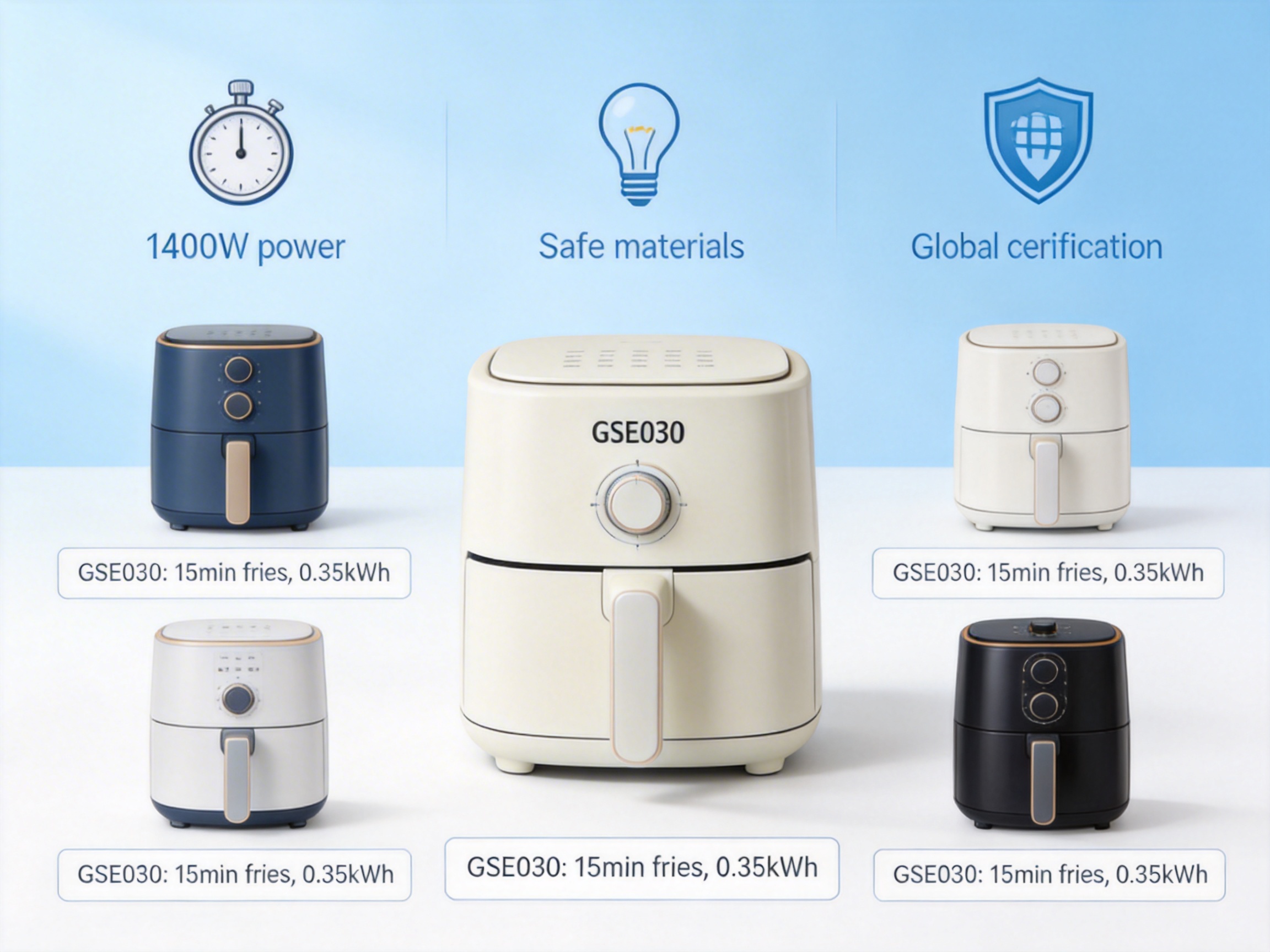 The GSE030’s key selling point is its balance of performance, safety, and efficiency. It cooks food quickly (15 mins for frozen fries) with minimal oil, uses food-safe materials, and has global certifications that allow it to be sold in over 100 countries. Additionally, its wholesale-friendly logistics make it an ideal choice for businesses.