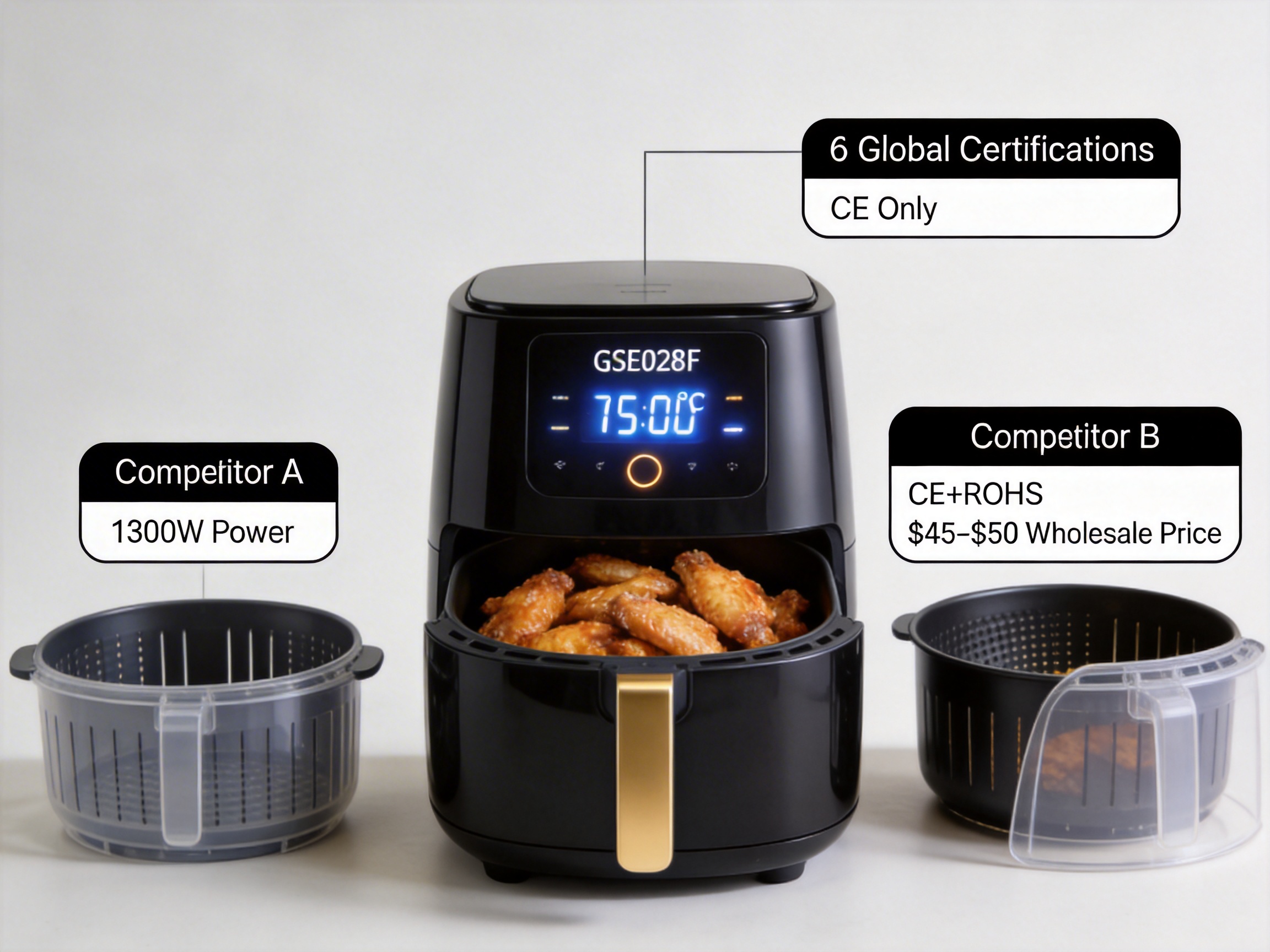 With dozens of air fryer models flooding the market, the GSE028F distinguishes itself through performance, safety, and value. Below are its key competitive edges:
