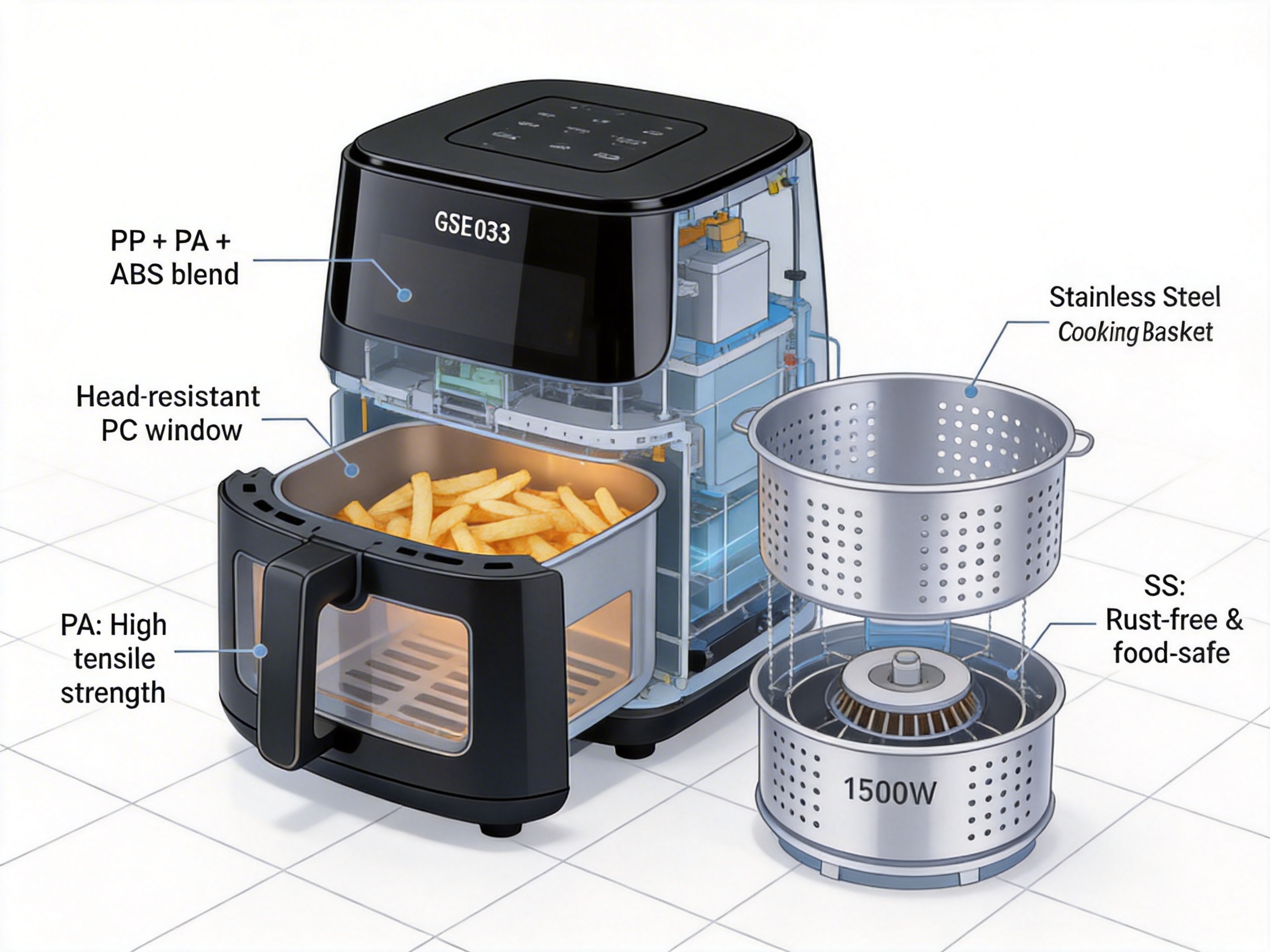 Many mid-range air fryers use single plastics (e.g., PP or ABS) or low-grade stainless steel, which can crack, warp, or rust over time. The GSE033 series’ blend of PP+PA+ABS+PC+SS solves this problem: the PA adds tensile strength to the outer casing, the PC ensures the window is scratch-resistant, and the SS cooking basket is rust-free and dishwasher-safe. Consumer Reports’ 2022 testing found that appliances using this multi-material blend had a 30% longer lifespan than those using single plastics—making it a cost-effective investment for long-term use.